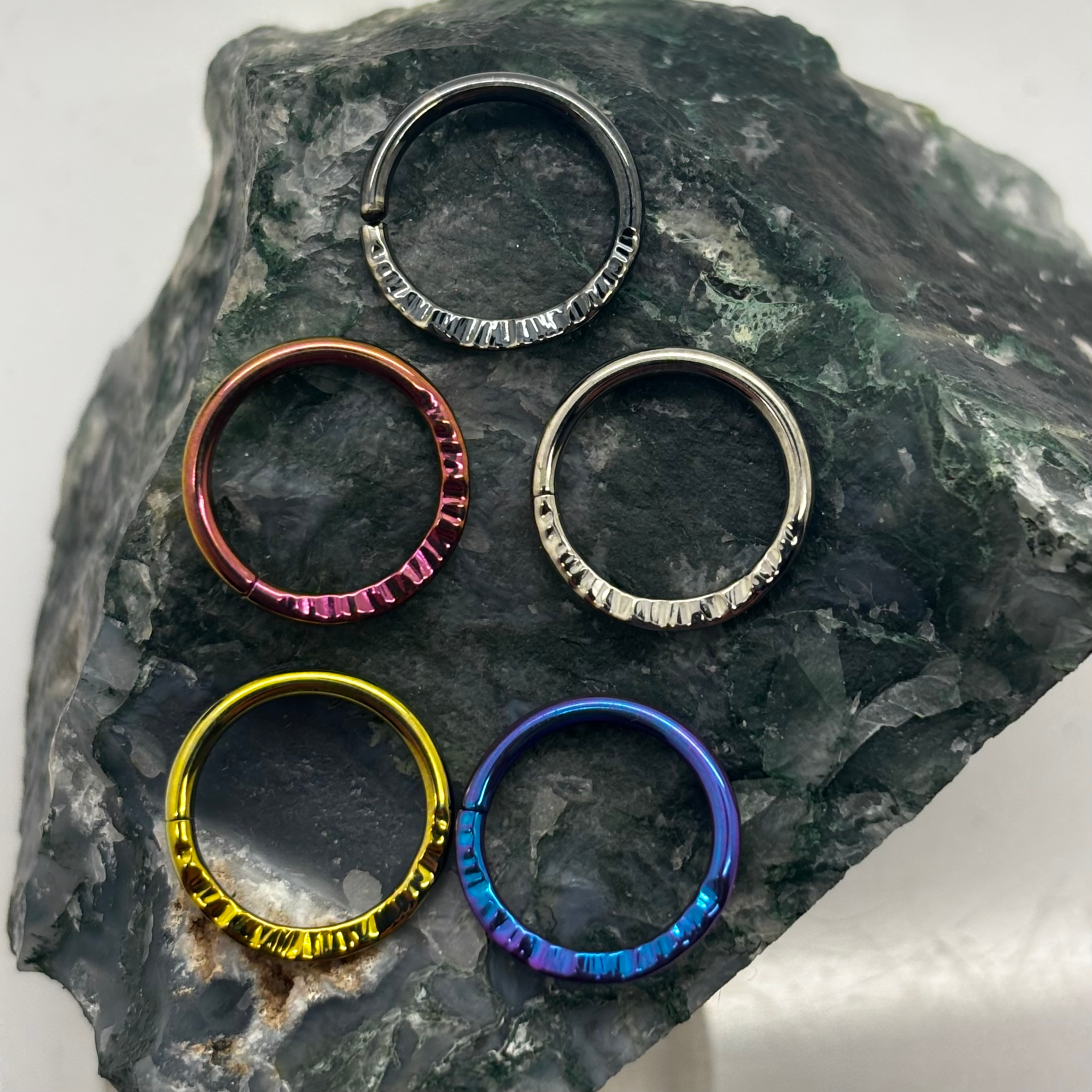 Daith insert with a 16g titanium hinged seam ring anodized rainbow