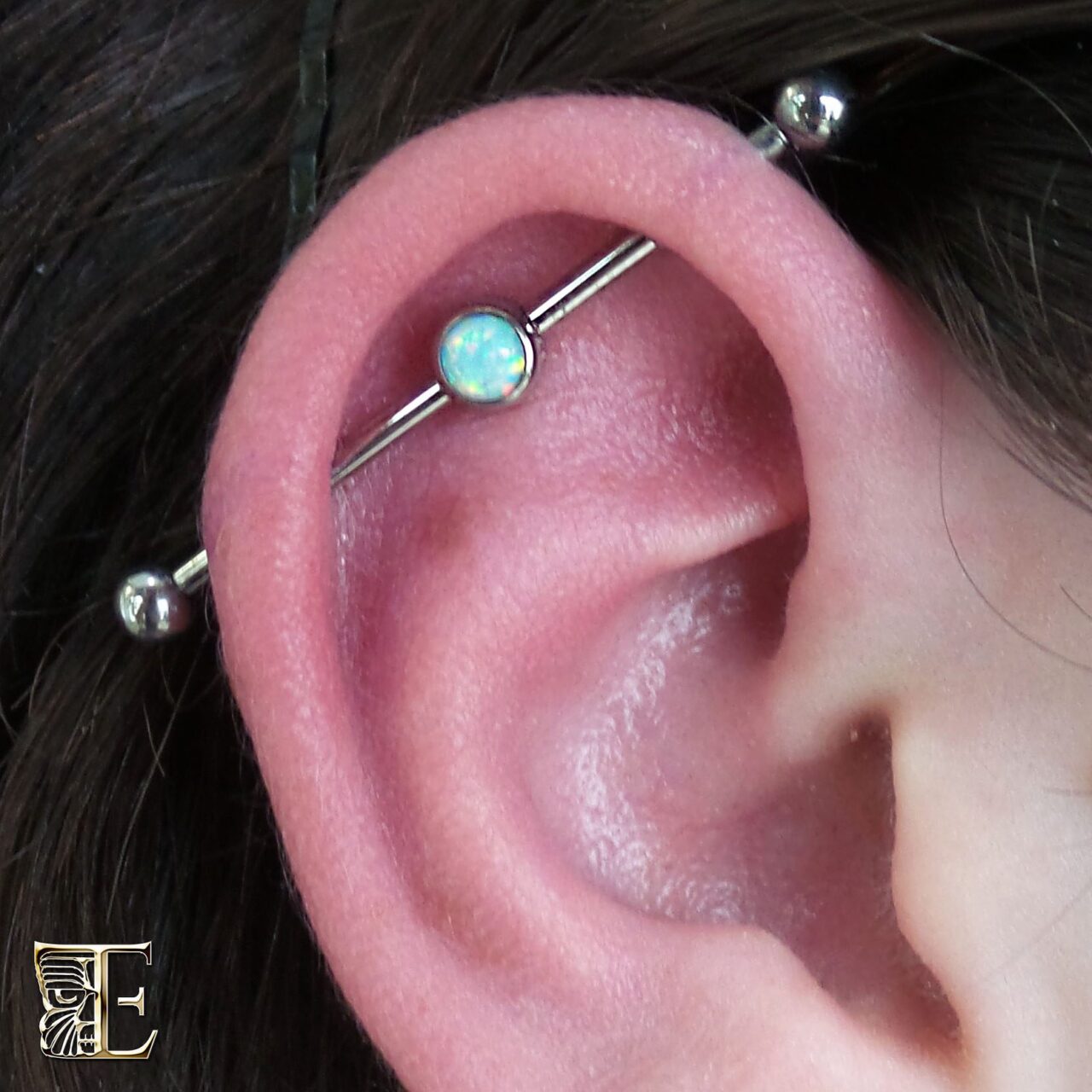 A traditional industrial piercing is a pair of cartilage piercings connected by a single 14ga straight